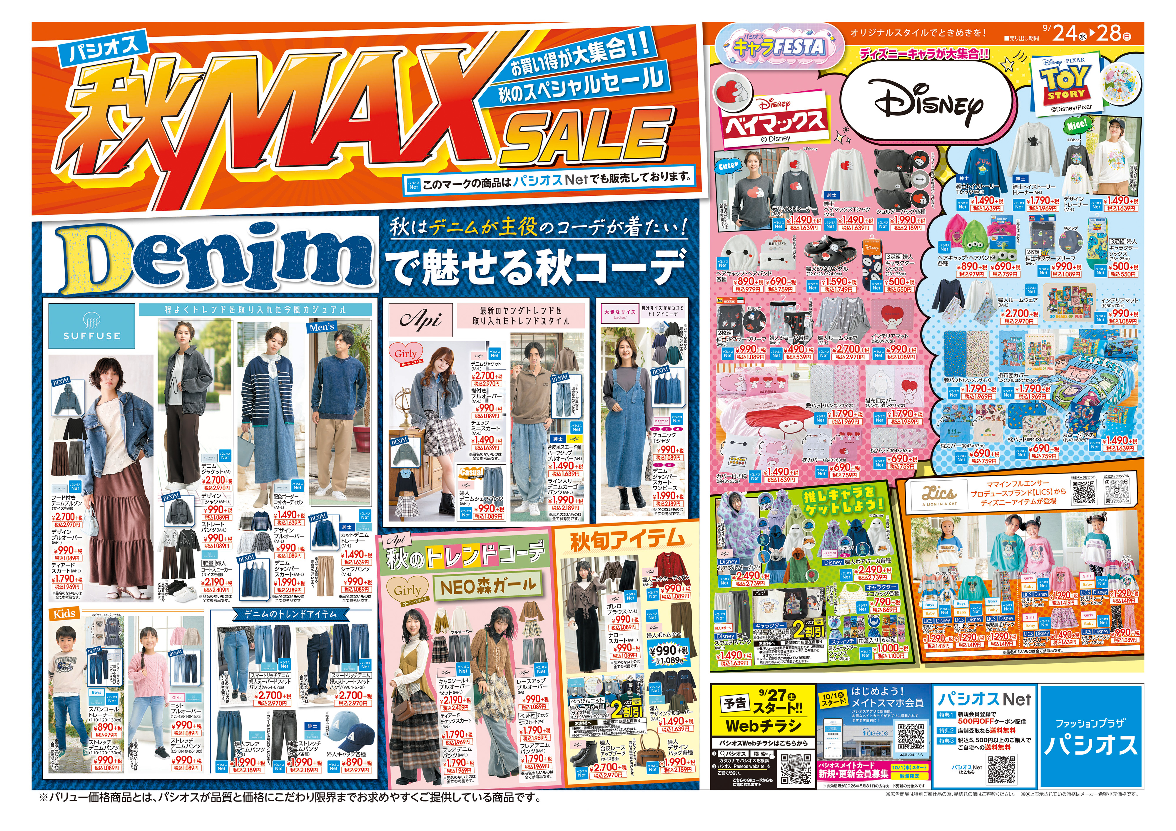 株式会社田原屋(本社所在地:神奈川県川崎市、代表取締役会長:田熊 太郎、代表取締役社長:甲斐 直裕)は、9/24(水)よりファッションプラザ[パシオス(https://www.paseos.co.jp/)]で【秋MAX SALE】を開催いたします。