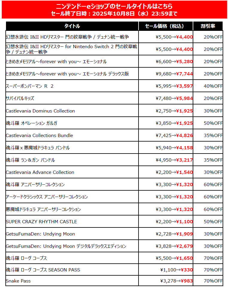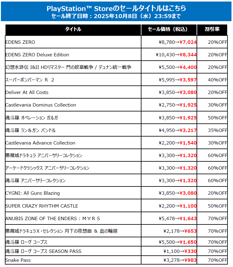 株式会社コナミデジタルエンタテインメント(以下、KONAMI)は、ニンテンドーeショップ、PlayStation™ Store、Steam Store、Xbox Storeにおいて、ダウンロード版ゲームを最大80%オフでお得に購入できるKONAMI「TOKYO GAME SHOW 開催記念セール」を開催中です。