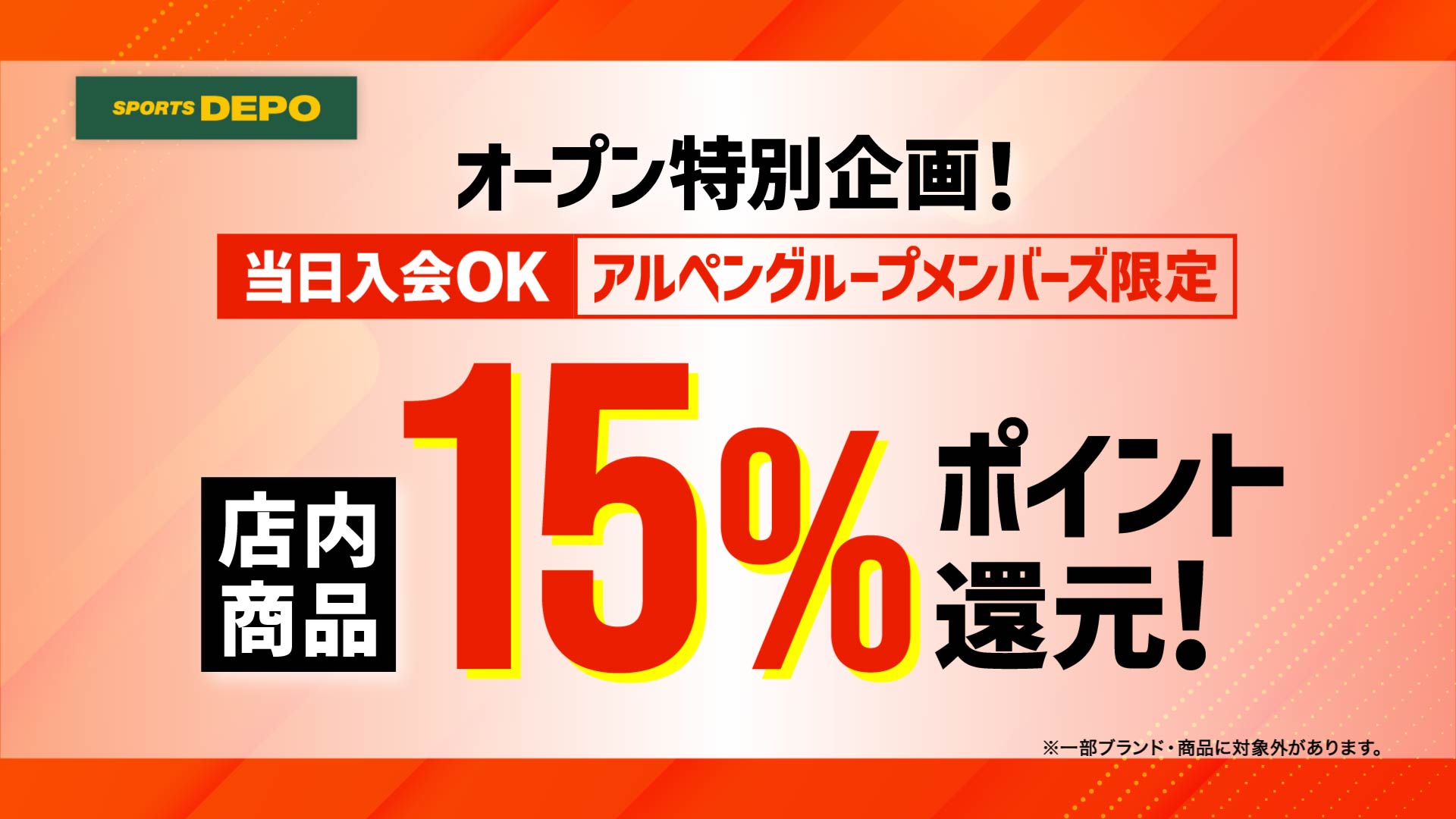 オープンを記念して10月3日(金)~10月9日(木)の期間、グランドオープンセールを開催!セール期間中はスポーツデポ イオンモール須坂店にて店内商品お買上げでアルペンポイント15%還元いたします。