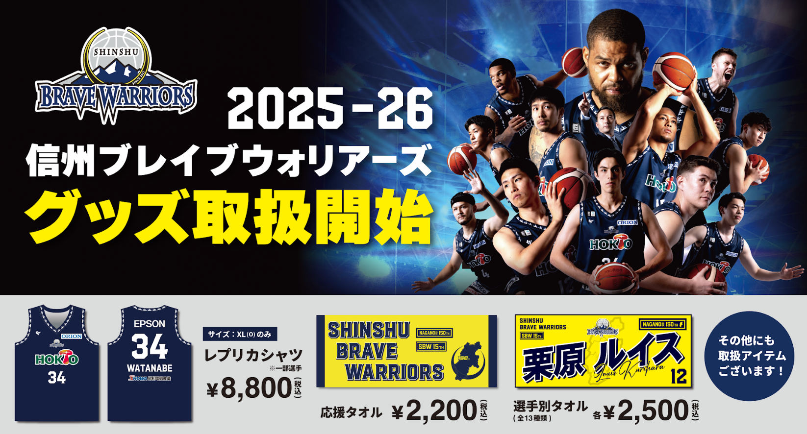 さらにB.LEAGUE所属のプロバスケットボールチーム、信州ブレイブウォリアーズの公式グッズの取り扱いを開始します。熱狂的なファンの方はもちろん、地域の皆さまにも愛されるチームのユニフォームやタオルなど人気アイテムをお買い求めいただけます。