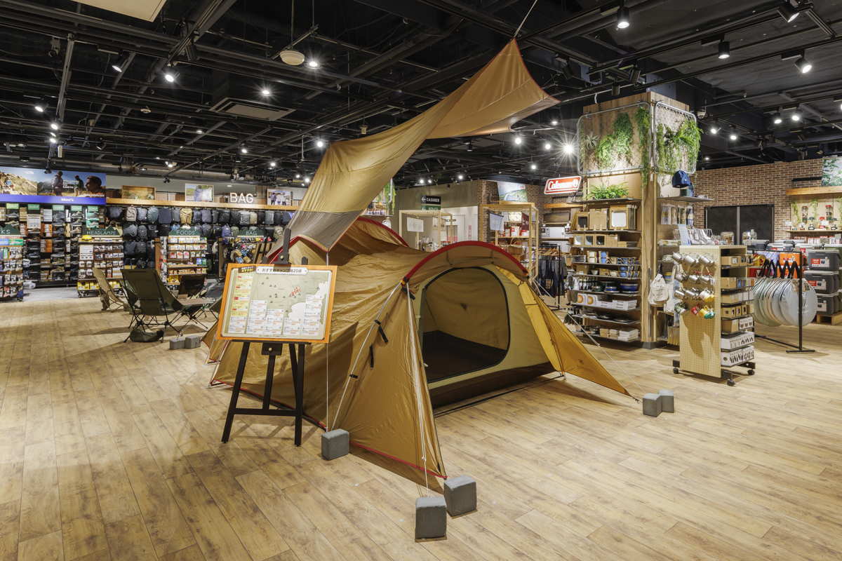 「DINing」コーナーでは、テーブルウェアやクッキングギアなど、日常生活にも取り入れやすいアイテムを多数ラインアップ。アウトドアだけでなく、家庭でも活躍する実用的な商品が揃っています。「SLEEPing」コーナーでは、ずらりと並んだランタンの灯りを楽しめるほか、販売スタッフによる丁寧なレクチャーを受けながら、お好みのテントをその場で選ぶことができる体験型スペースとなっています。