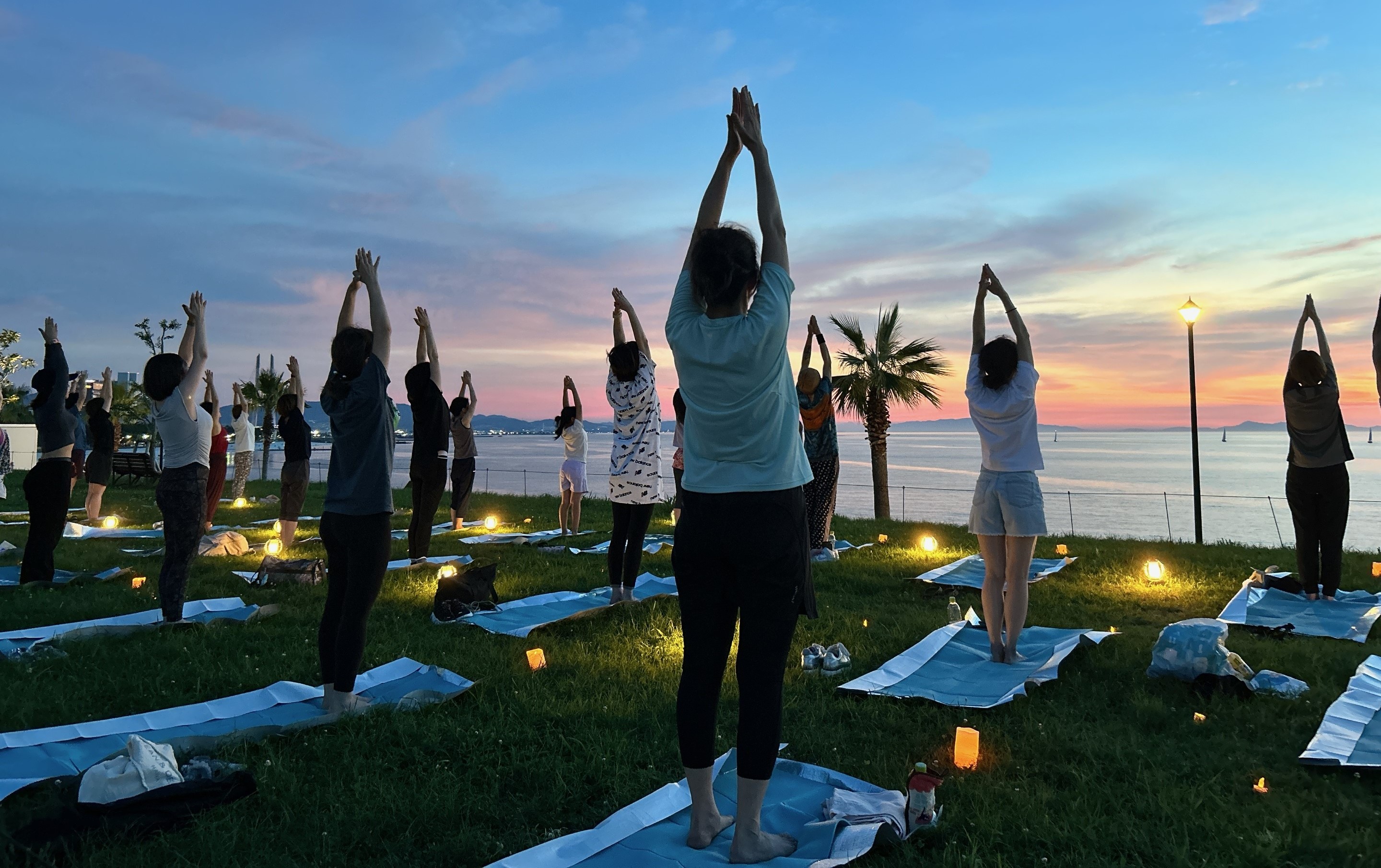 りんくうプレミアム・アウトレットでは、スポーツを通じ、心身、社会的にも健康な「ウェルビーイング」の増進につなげていくことを目的に、開放的なシーサイドエリアでウェルネスイベントを定期的に開催しています。青く広がる海や暮れゆく夕日を見ながら、非日常な空間で心身ともに気持ちよく体験できるシーサイドヨガをお楽しみください。