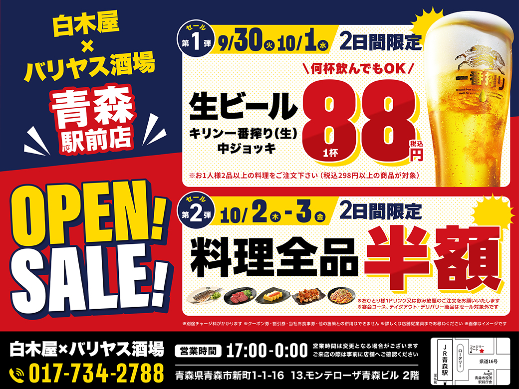 「白木屋」「魚民」「目利きの銀次」などを全国に展開する株式会社モンテローザ(本社:東京都杉並区、代表取締役:大神輝博)は、2025年9月30日(火)に「白木屋×バリヤス酒場 青森駅前店」をオープンします。