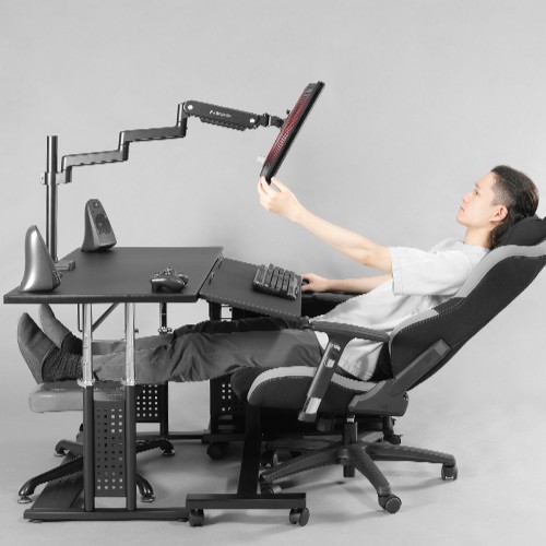 リクライニングしても画面を引き寄せられる、ロングタイプのモニターアーム
