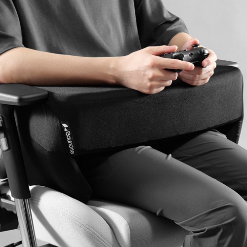 ひざ上に腕置きスペースを増築、引き寄せて身体を囲える肘掛けクッション