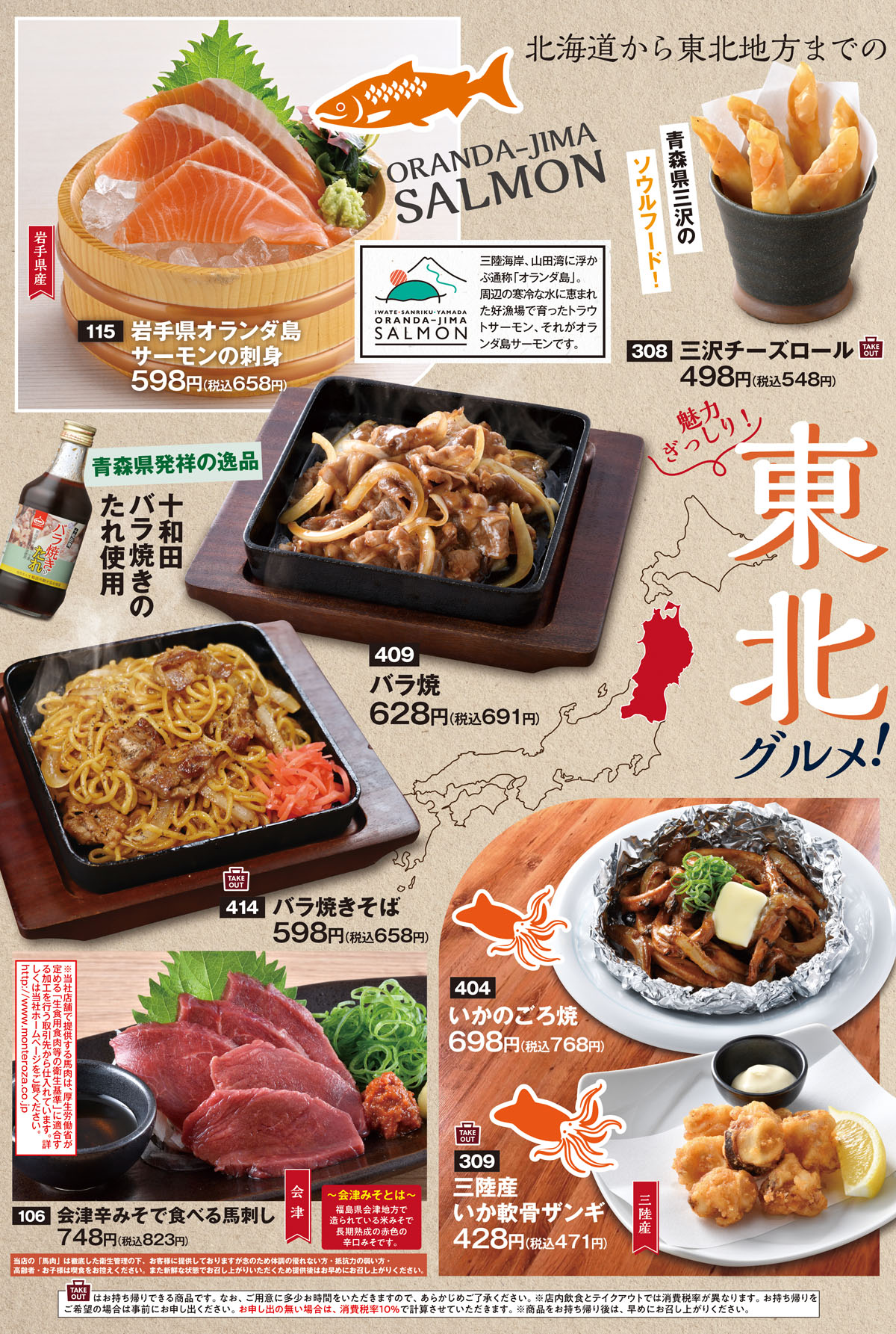 北海道・東北グルメを中心に、海鮮から肉料理、ちょっとしたおつまみまで様々なお料理をご用意しております。
