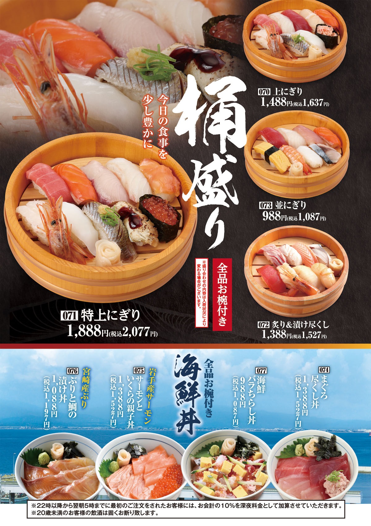 お刺身や懐かしい郷土料理など、和食中心の居酒屋定番メニューのほか、自慢の寿司もお楽しみいただけます。