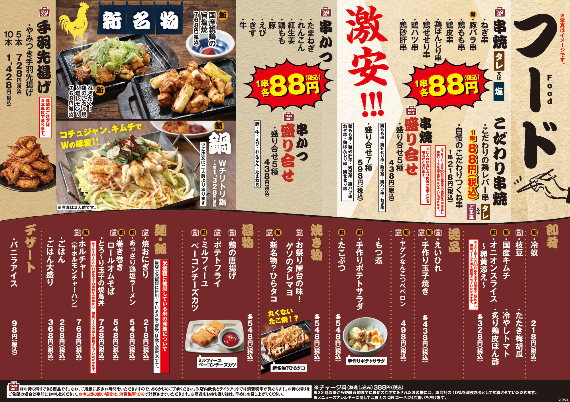 秘伝のソースで食べる“串かつ”と炭火焼きの“焼き鳥”をいっぺんに楽しめる居酒屋です。 本場大阪の味と、定番の居酒屋メニューを、気軽にふらっと立ち寄れる財布に優しい価格でご提供します。