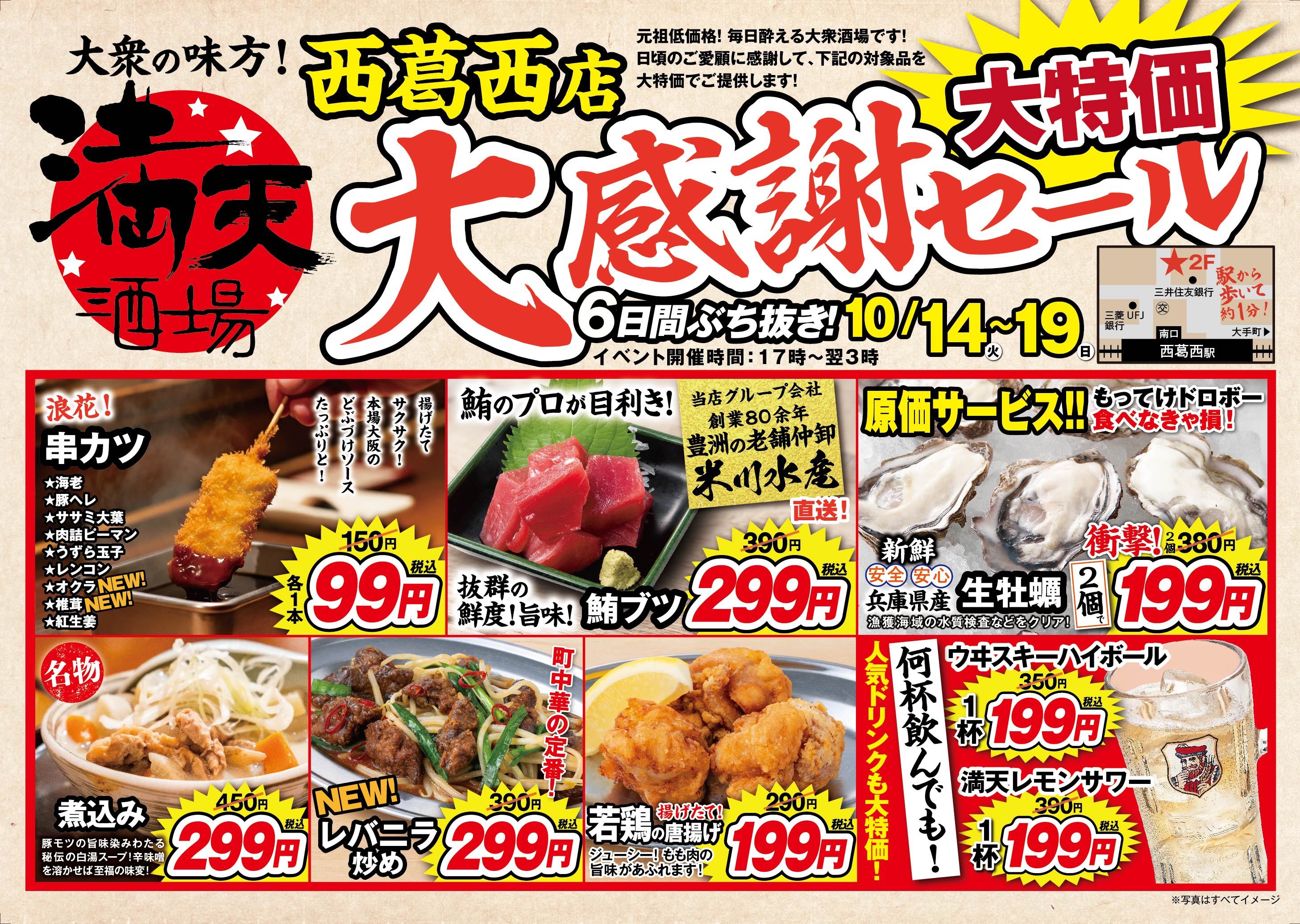 “大衆の味方”を掲げる元祖低価格『満天酒場』西葛西店(運営:株式会社大庄)は、2025年10月14日(火)から10月19日(日)までの6日間限定で、日頃のご愛顧に感謝を込めて「大特価!大感謝セール」を開催します。期間中17時〜翌3時の間、海老・豚ヒレ・肉詰めピーマンなどの「串カツ」(全9種)を通常1串150円のところ99円、国産「生カキ」通常2個380円を2個199円で提供。いずれも1つ100円以下というほぼ原価の破格値です。さらに、名物の「もつ煮込み」は通常450円が299円、豊洲市場直送の「鮪ブツ」は通常390円が299円、「若鶏の唐揚」は通常290円が199円、「レバニラ炒め」は通常390円が299円と、人気のつまみ4種も衝撃の超特価です!