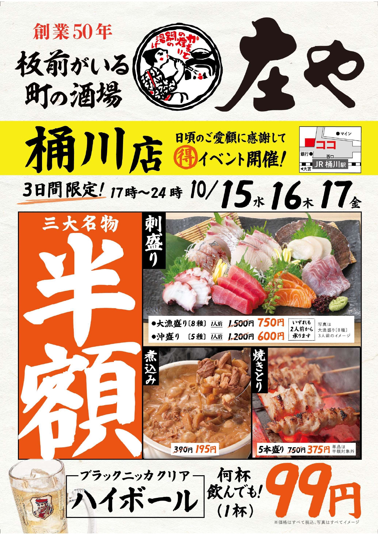 「はい!よろこんで」でお馴染みの“板前がいる町の酒場”『庄や』桶川店(運営:株式会社大庄)は、2025年10月15日(水)より10月17日(金)までの3日間、17時から24時までの限定で、日頃のご愛顧に感謝を込め「刺身盛り合わせ」「煮込み」「焼き鳥」の三大名物を半額とする“半額感謝祭”を実施します。豊洲仲卸直送の鮮魚を使った刺身盛り合わせ「大漁盛り(8種盛)」は、通常1人前1,500円を半額の750円、同「沖盛り(5種盛)」は通常1人前1,200円を600円にて。加えて、不動の人気「煮込み」は通常390円を半額の195円。さらに、創業から受け継がれる味わい「焼きとり五本盛り」は、通常750円のところ半額の375円での超特価で提供します。