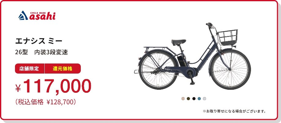 店頭では、電動アシスト自転車の特別割引き商品をご用意しています。