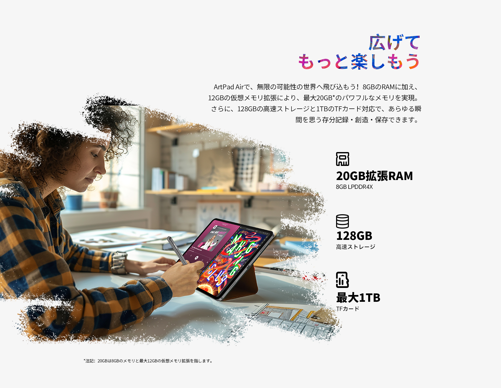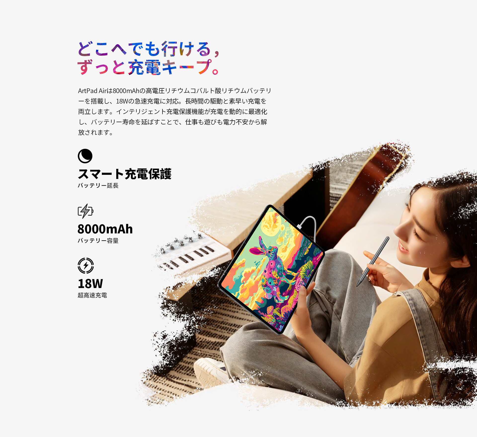 Valhallアーキテクチャに基づき、動作周波数1000MHzの高性能「Mali-G57 MC2」GPUにより、ArtPad Airは鮮明な視覚表現と滑らかで応答性の高いゲーム体験を実現。AR、VRなどの先進機能にも対応し、没入感のあるデジタル体験を提供します。