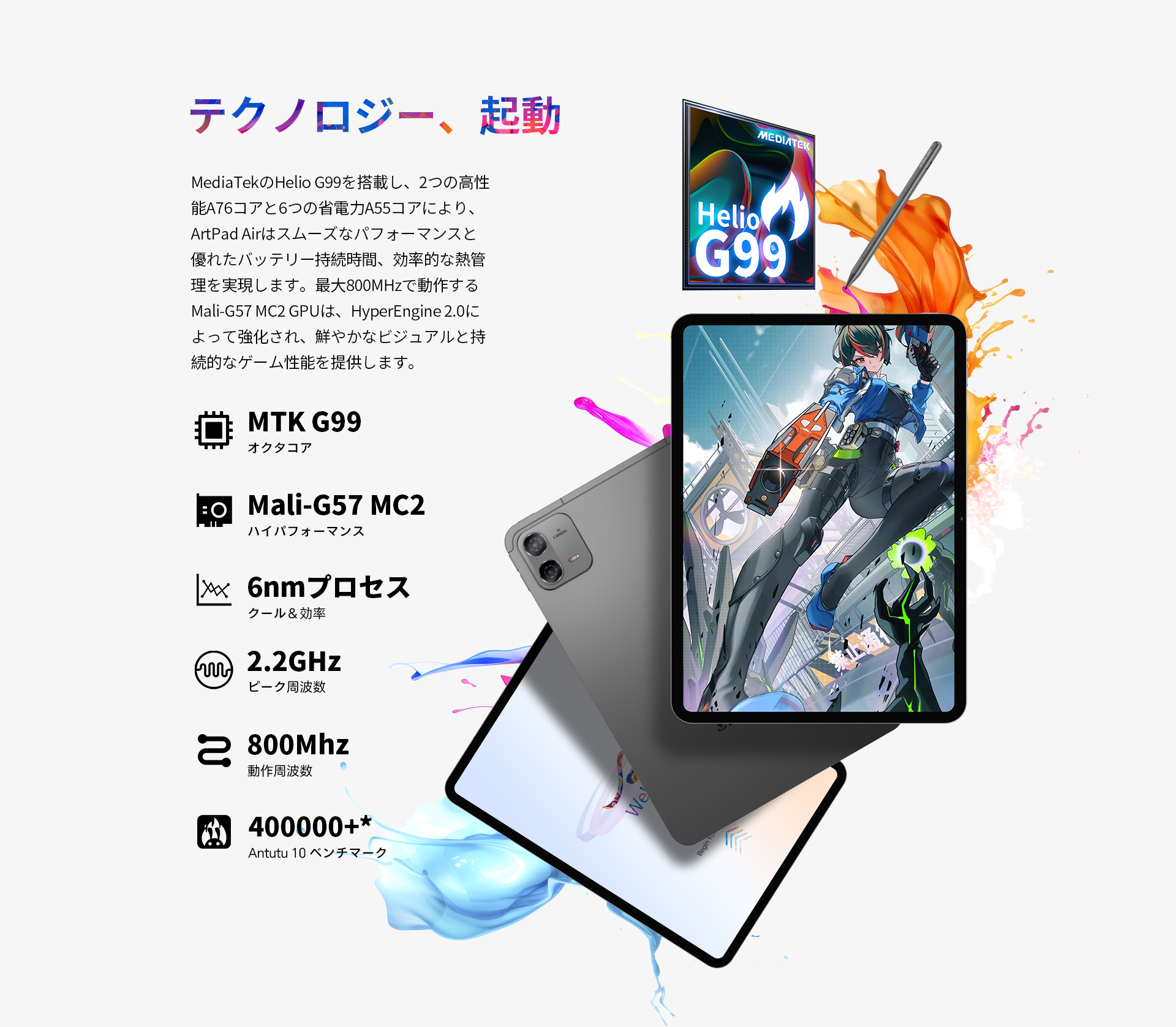 Teclast ArtPad Airは、フラッグシップクラスの4Gプロセッサ「MediaTek Helio G99」を搭載。2つの高性能A76アーキテクチャコアと2.2GHzの高クロック周波数により、快適な新たなタブレット体験を提供。6つの高効率A55アーキテクチャコアが、低負荷時のエンターテイメントを長時間持続させます。