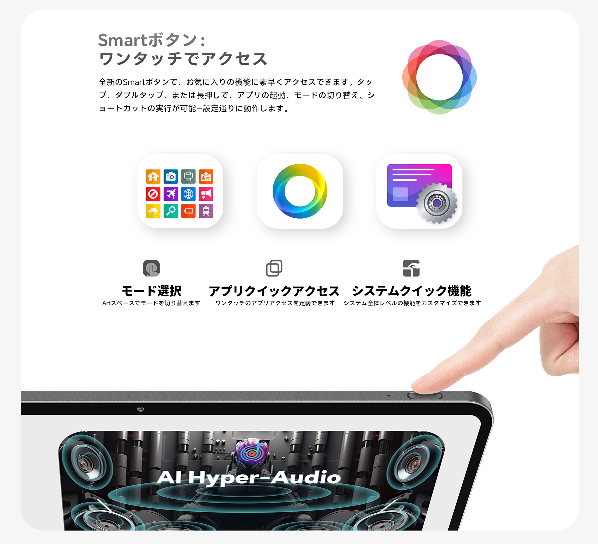Teclast ArtPad Airは「Smart Button」クイックボタンを装備。シングルクリック、長押し、ダブルクリックの3つの操作を任意のアプリケーションまたはシステム機能に割り当てて、素早く起動することが可能です。