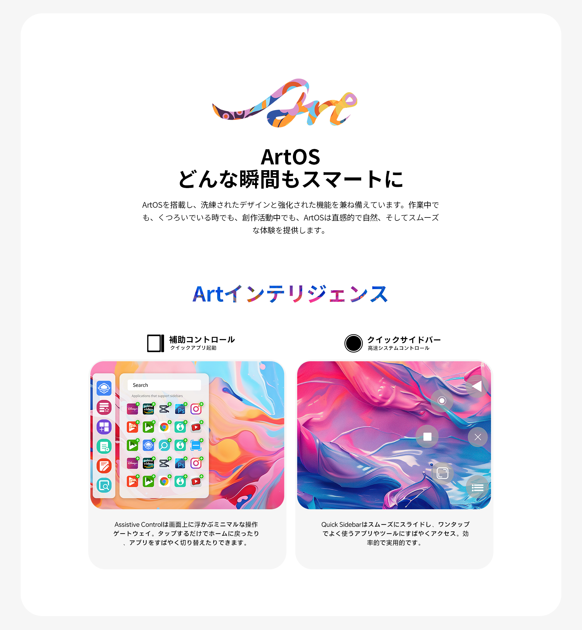 Teclast ArtPad Airは、Android 15をベースにした新OS「ArtOS」を搭載。フローティングボール、サイドバー、三本指スクリーンショットなど、実用性の高い機能を新たに追加。操作感はスムーズで、全体的なデザインはモダンな美感に適合しています。