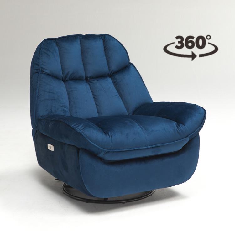 ワンボタンで角度調整ができる電動リクライナー。ネイビーのベルベット調生地が上品で、360°回転機能付き。包み込まれるような座り心地で自分だけのくつろぎ空間を演出します。