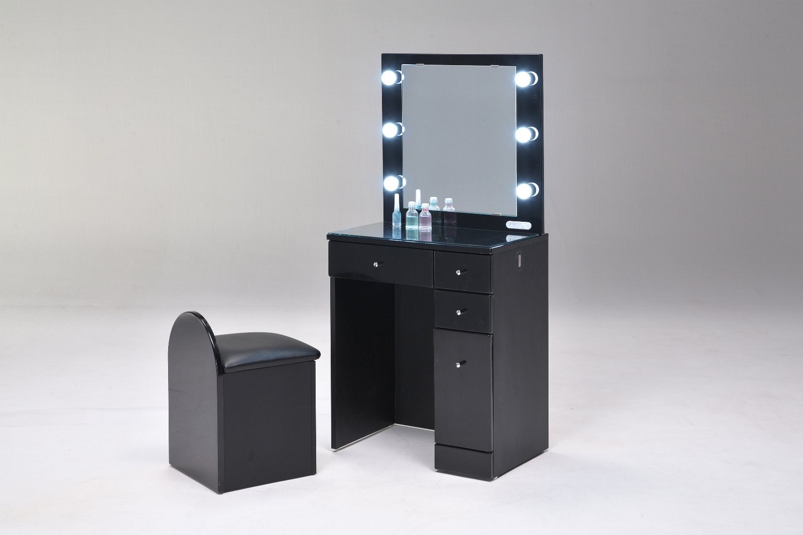 ライト付きミラーが目を引くドレッサーセット。艶やかなブラックカラーが上質な印象を与え、毎日の身支度を華やかに。引き出し収納も備えた人気のアイテムです。