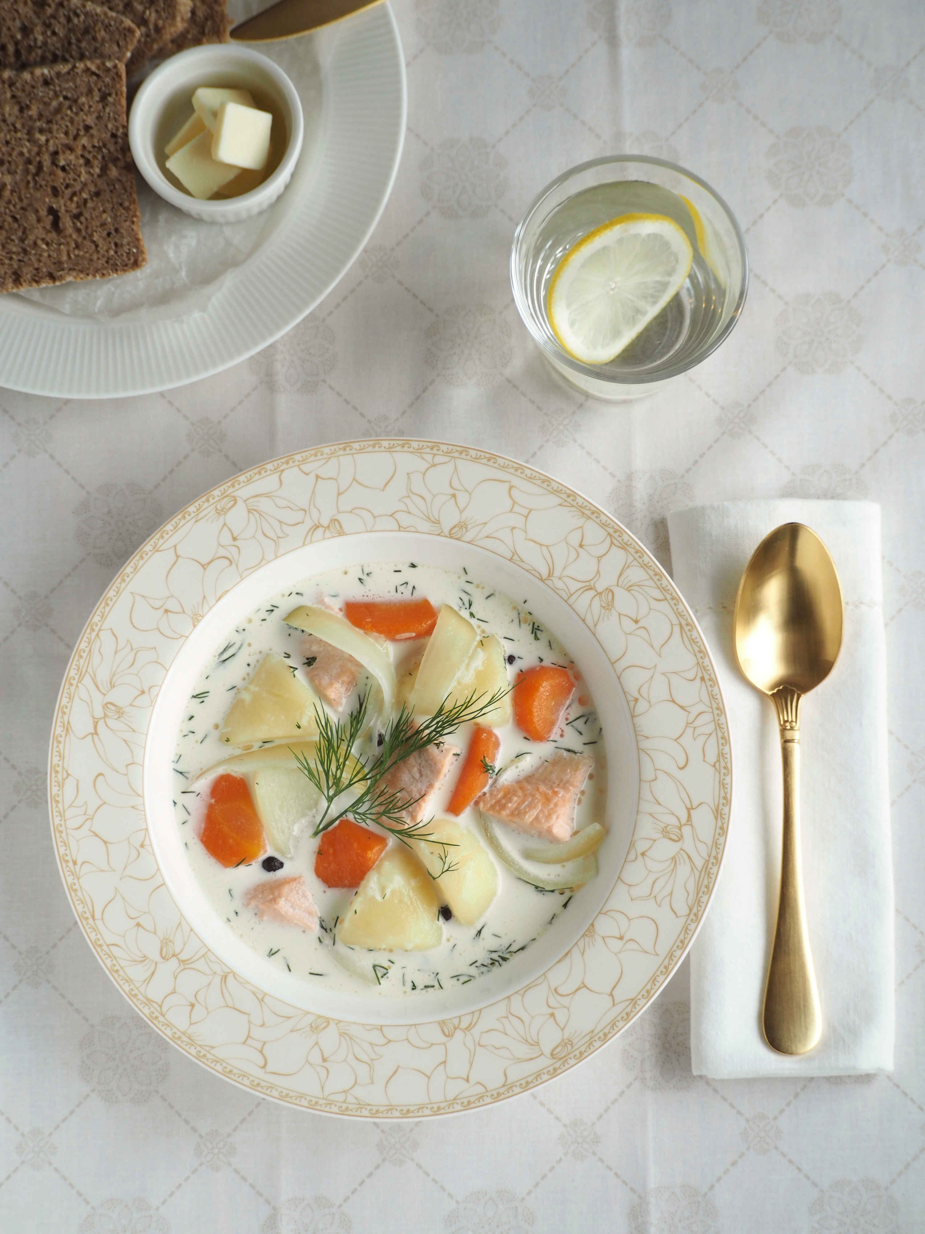 北欧の家庭料理として愛されるサーモンスープ。濃厚でクリーミーなスープに、脂がのったサーモンとほくほくのじゃがいも、香り豊かなディルを添えました。