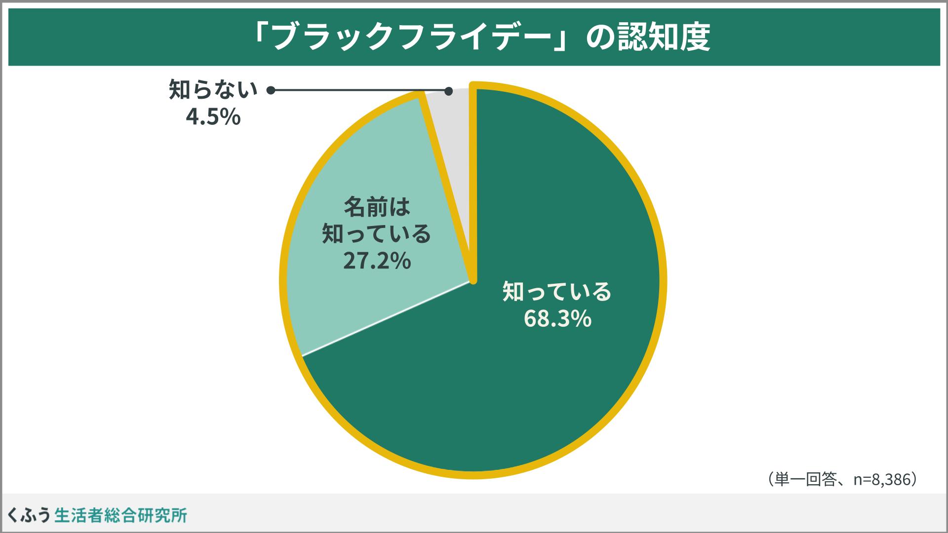 「ブラックフライデー」について、「知っている」(68.3%)「名前は知っている」(27.2%)を合わせた95.5%が認知している結果となりました。