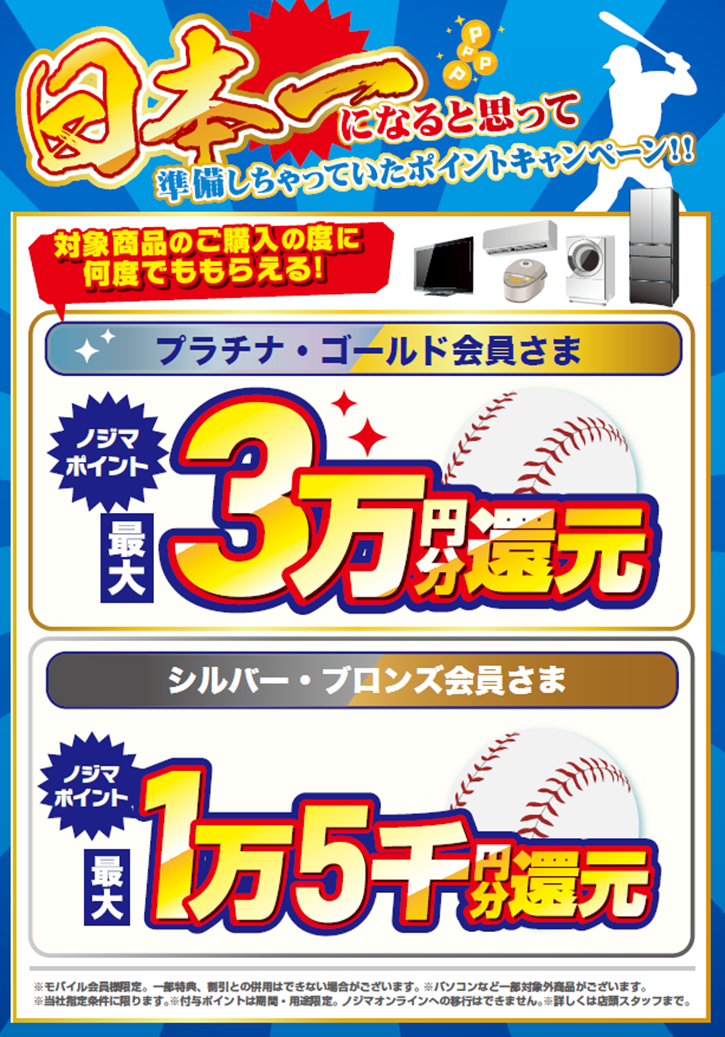 株式会社ノジマ(神奈川県横浜市、代表執行役社長・野島廣司)は、このたびのクライマックスシリーズの結果をうけ、当社が応援する横浜DeNAベイスターズの2年連続の日本一を願って準備していたポイントの還元や、お買い得な特価商品を大放出する「日本一になると思って準備しちゃってましたセール」を10月22日(水)より開催いたします。
