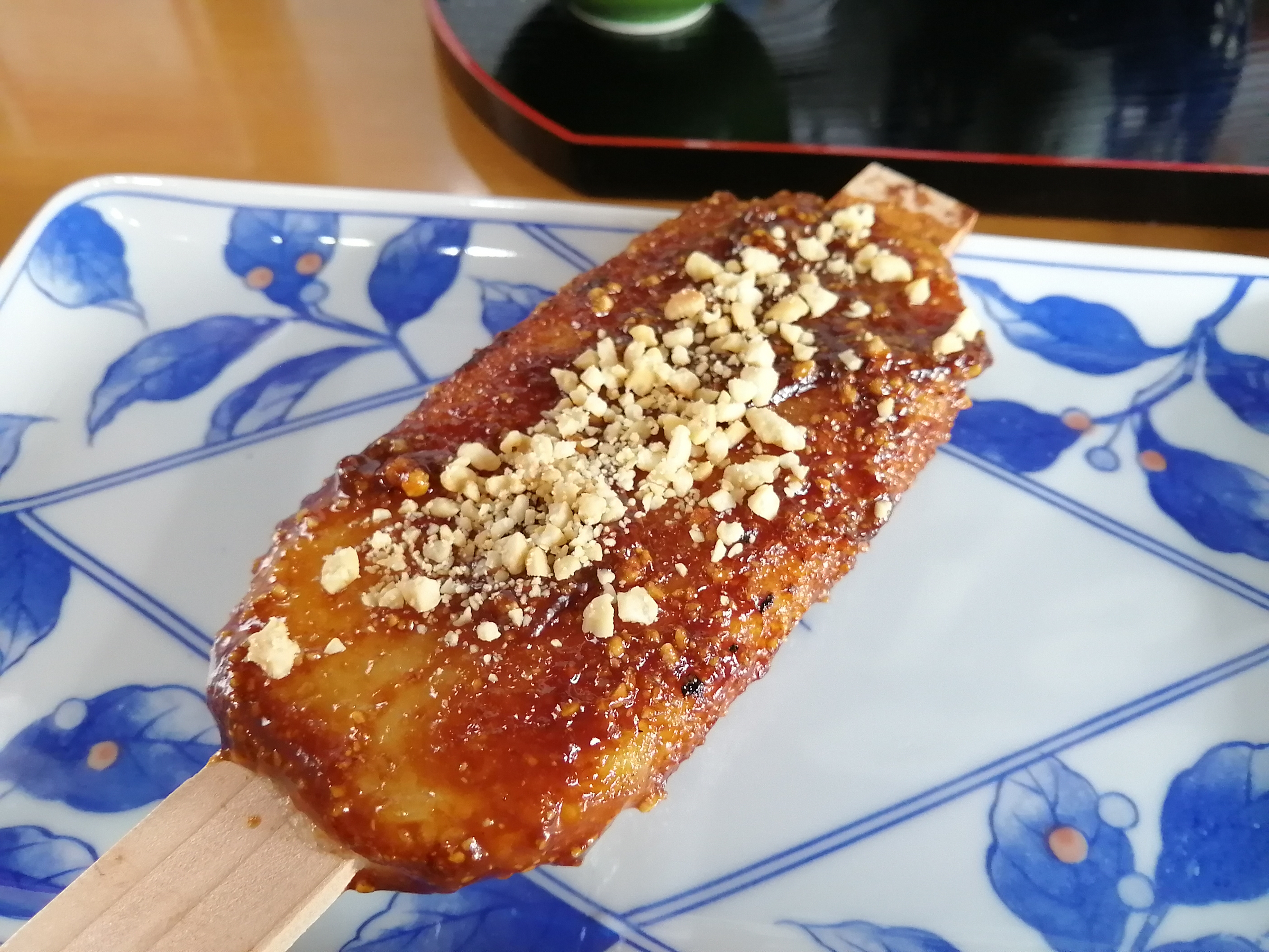 道の駅志野・織部にあるロトさん家。わらじ型の餅に、醤油ベースのたれにクルミ・胡麻・落花生を加えたクルミだれが香ばしく香ります。