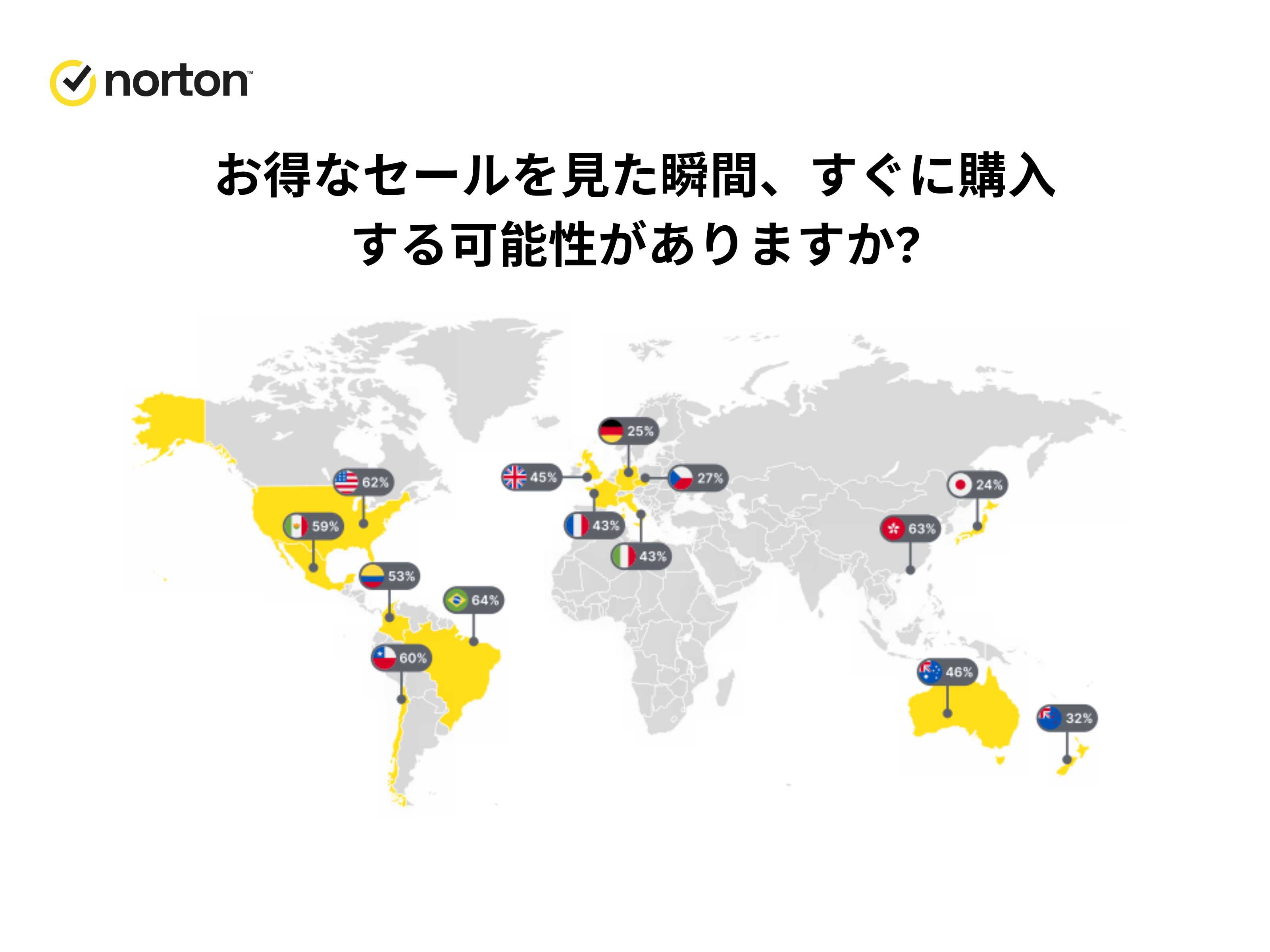 ただ各国の回答から比較してみると、ブラジル(64%)や香港(63%)は、お得な商品を見つけるとすぐに購入する傾向が最も高い一方で、日本(24%)やチェコ共和国(27%)の人々は、割引に左右されにくい傾向が見られます。