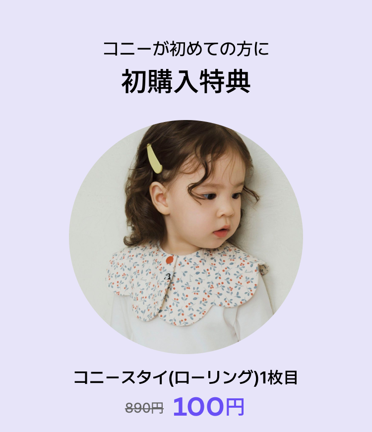 コニーでのお買い物が初めての方「コニースタイ(ローリング)」を1枚目100円で購入できる特典をご用意。