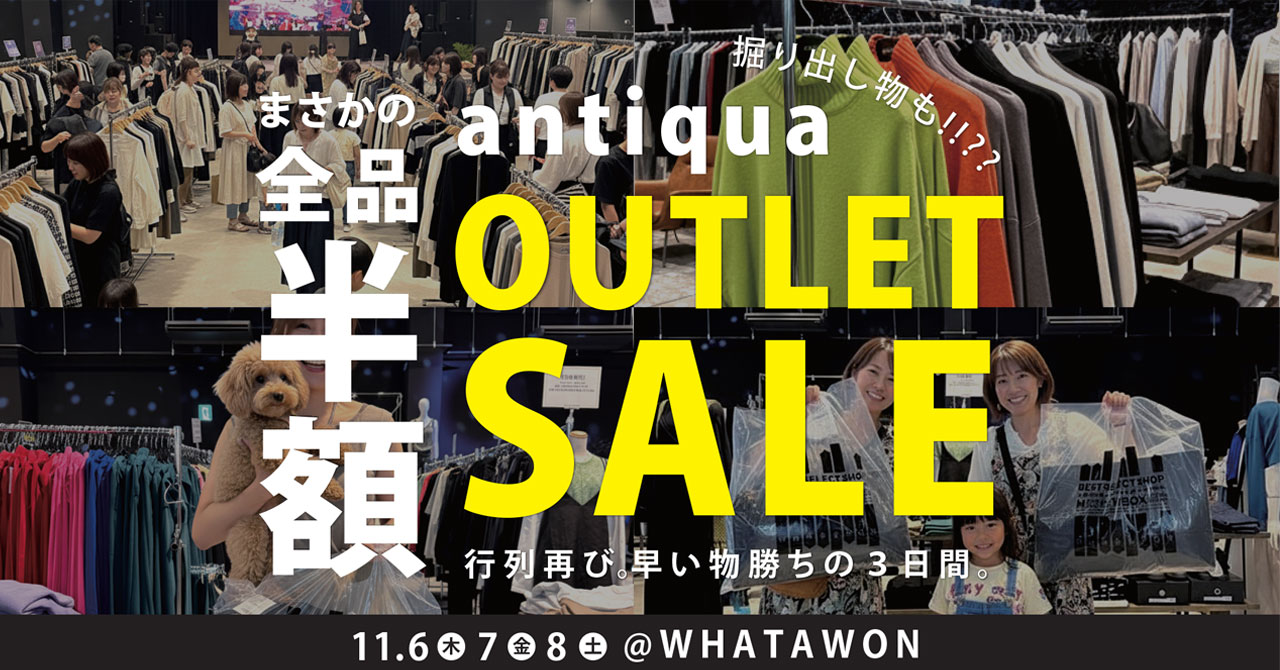 株式会社ANTIQUA(本社:大阪府和泉市)が滞在型エンターテインメントモール「WHATAWON」にて、2025年11月6日(木)から8日(土)までの3日間、全品半額となる「antiqua×WHATAWON OUTLET SALE」を開催いたします。