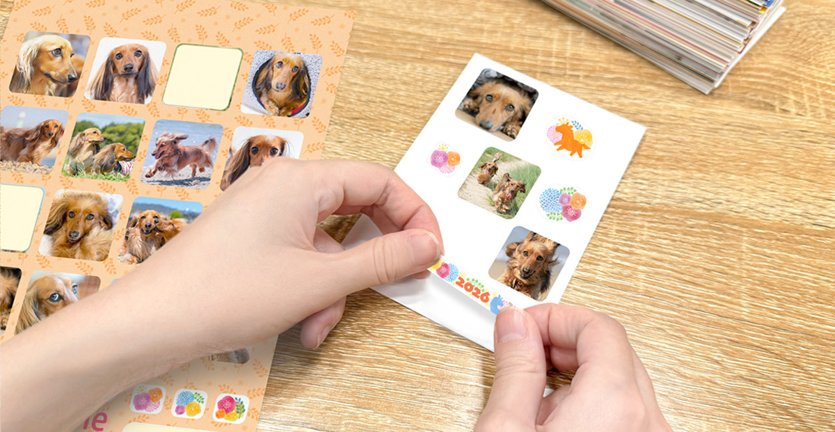 年賀フォトシールを使えば、市販の無地年賀状に貼るだけで、誰でも簡単に華やかな年賀状を作成できます。