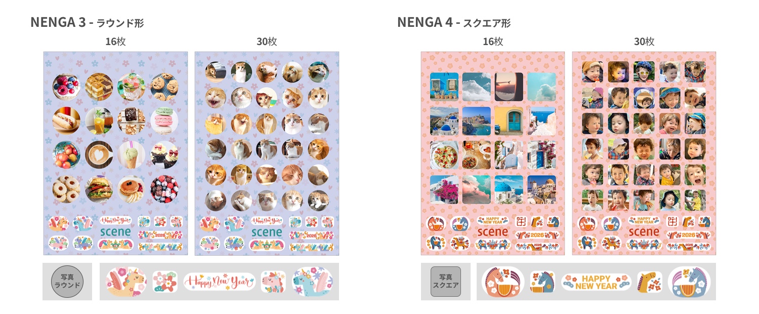 Sceneアプリから注文できる季節限定販売の「年賀フォトシール」は、台紙部分に干支や吉祥文様を描いた特別なデザインで、イラスト部分もはがして貼ることができる年賀状向けのシール商品です。