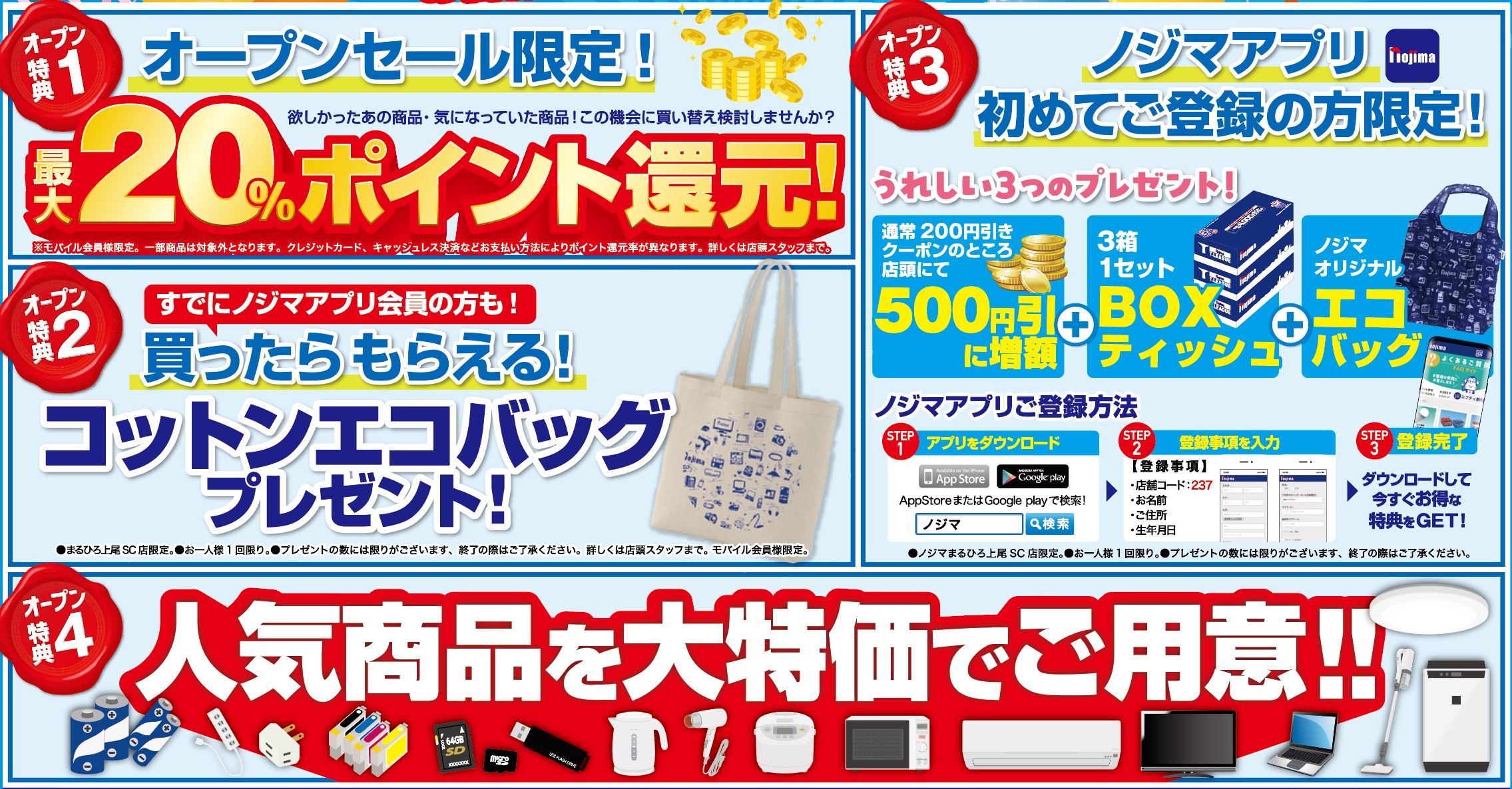 株式会社ノジマ(神奈川県横浜市 代表執行役社長 野島廣司 以下「ノジマ」)は、「ノジマ まるひろ上尾SC店」をオープンいたします。「まるひろ上尾SC」はJR上尾駅とペデストリアンデッキでつながるアクセス抜群の施設となっており、日々の暮らしから趣味の範囲まで幅広い店舗が揃っています。家電やスマホなど、デジタルに関するご相談はぜひノジマにお越しくださいませ!