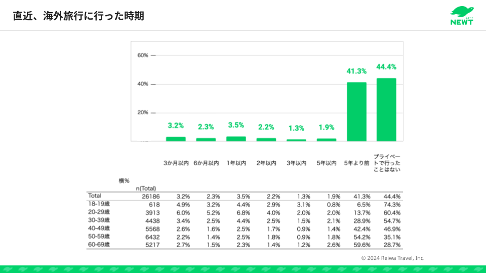 若年層に目を向けると、10代の約7割、20代の約6割が未経験と、若年層の“海外デビュー”が進んでいない現状が浮き彫りになりました。一方で、10〜20代で海外旅行に行っている人は他の世代より直近1年以内の渡航が多いという結果も。若者のあいだで、「行ける人は頻繁に行く」「行かない人は全く行かない」という二極化傾向が見られます。