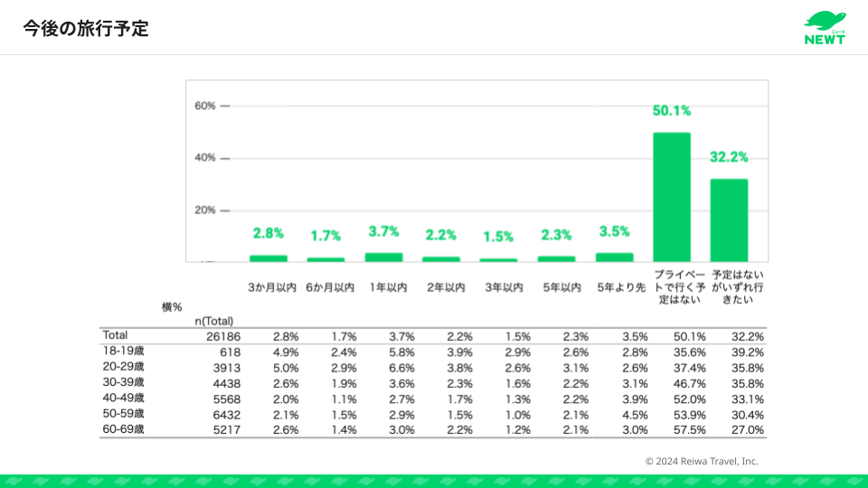 調査の結果、過去5年以内に海外旅行へ行った人は14.3%にとどまり、半数以上が「今後の旅行予定はない」と回答。一方で、「具体的な予定はないが、いずれ行きたい」人が32.2%と、潜在的な旅行需要は依然として高いことがわかりました。