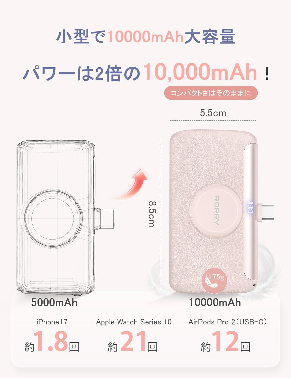 10000mAhの安心感をポケットサイズに凝縮。iPhoneもApple Watchも“これ1台”でOK、女性に嬉しいかわいさと機能性を両立。