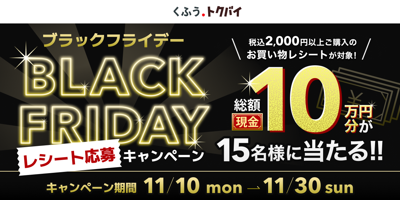 対象店舗での税込2,000円以上の買い物レシートを使って「くふう トクバイアプリ」の専用ページから応募すると、抽選で現金総額10万円が当たる、ブラックフライデーセールでの買い物が楽しくなるキャンペーンです。