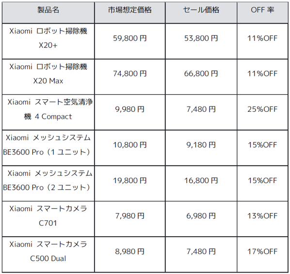 おうち生活をより快適で、効率化するために、スマート家電のサポートは役に立ちます。高い吸引力と自動集塵を兼ね備えた「Xiaomi ロボット掃除機 X20+」もブラックフライデー対象で、ユーザーはソファーで休憩しながら、スマホアプリや、音声でコントロールが可能で、掃除にかける時間と労力を省くことができます。また、家のネット環境をより快適にできるWi-Fi 7規格に対応した「Xiaomi メッシュシステム BE3600 Pro」や、シンプルなデザインで健康状態をスマホで一元化する「Xiaomi 体組成計 S400」、4K UHD高画質で家を見守る「Xiaomi スマートカメラ C701」などもお得な価格でご購入いただけます。