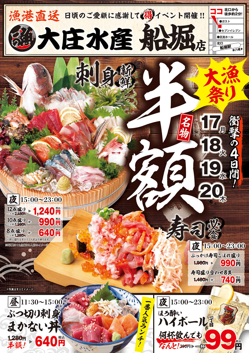 ホームキャンペーン【刺身、寿司、海鮮丼が半額!ハイボールは激安の99円】船堀の『大庄水産』で衝撃の4日間!11/17(月)から11/20(木)まで限定
