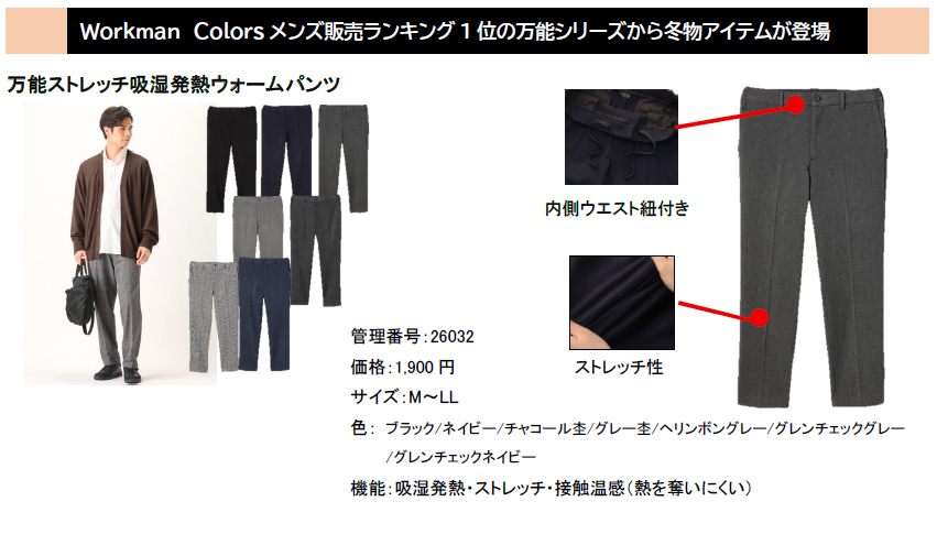 当社で話題の製品や限定生産アイテムなどが入荷する特別な3日間です。WORKMAN WEEKの今回のテーマは「冬の厳しい寒さに大活躍の高機能商品が大集結」と題して、これからのシーズンに大活躍する冬物アウターや、インナーを始め、2月から発売し、8か月で驚愕の18万本を販売した「万能パンツ」シリーズの冬物パンツも大好評につき、この度、再入荷いたします。また、7,000円以上のお買い上げで「多収納ゆるガジェットポーチ」をプレゼント※2これからの寒暖差を乗り切るアイテムを見つけに、ぜひお近くのWorkman Colorsと#ワークマン女子へお越しください。今回は11月14日(金)から開始するWORKMAN WEEKのイチ押しの3アイテムをご紹介します。