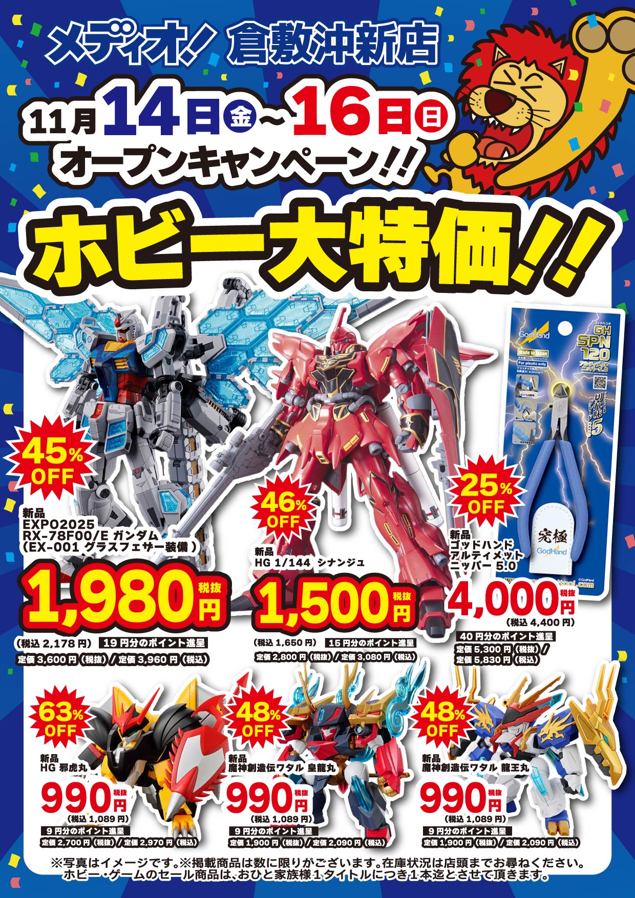 この度オープンする「メディオ!倉敷沖新店」は、既存の「メディオ!沖新店」に対しホビーの売場は3倍、トレーディングカードの売場は2倍に拡張。更にゲーム機、ゲームソフト、ゲーミング家電も新規で取り扱い、リニューアルオープンする店舗です。
