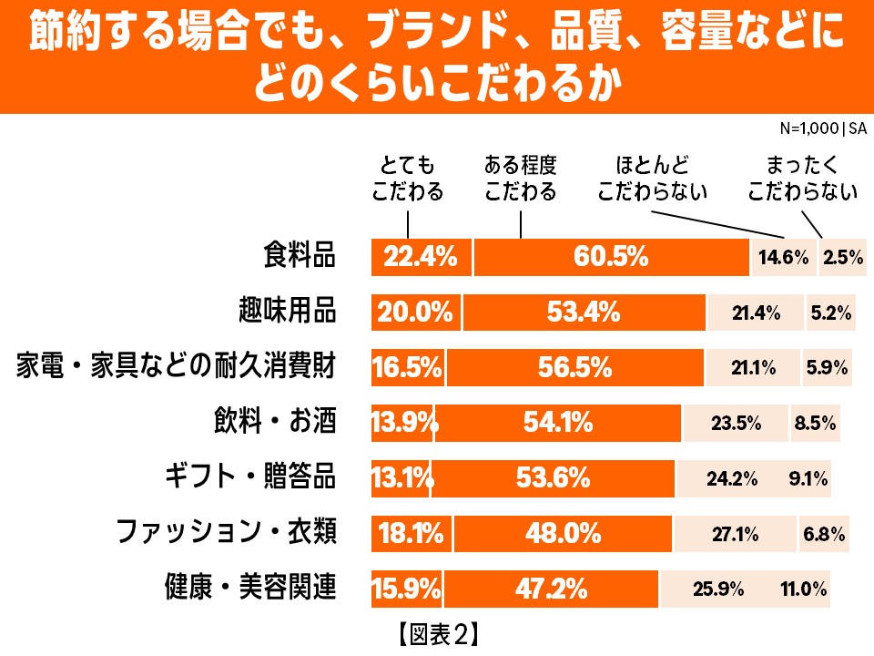 節約意識が高まり日々の支出を見直すなかでも、商品に対しては一定のこだわり※があり、特に「食料品」においては他の項目よりも格段に多い82.9%の人が商品にこだわると回答しました(とてもこだわる:22.4%+ある程度こだわる:60.5%)。その他の項目においても、それぞれ60%から70%の人が商品にこだわると回答しており、「安ければよい」というわけではないことが分かりました。【図表2】※ブランド、品質・機能性、デザイン、容量・サイズ、最新モデル・新商品、付属サービス(保証・ポイント)などへのこだわり