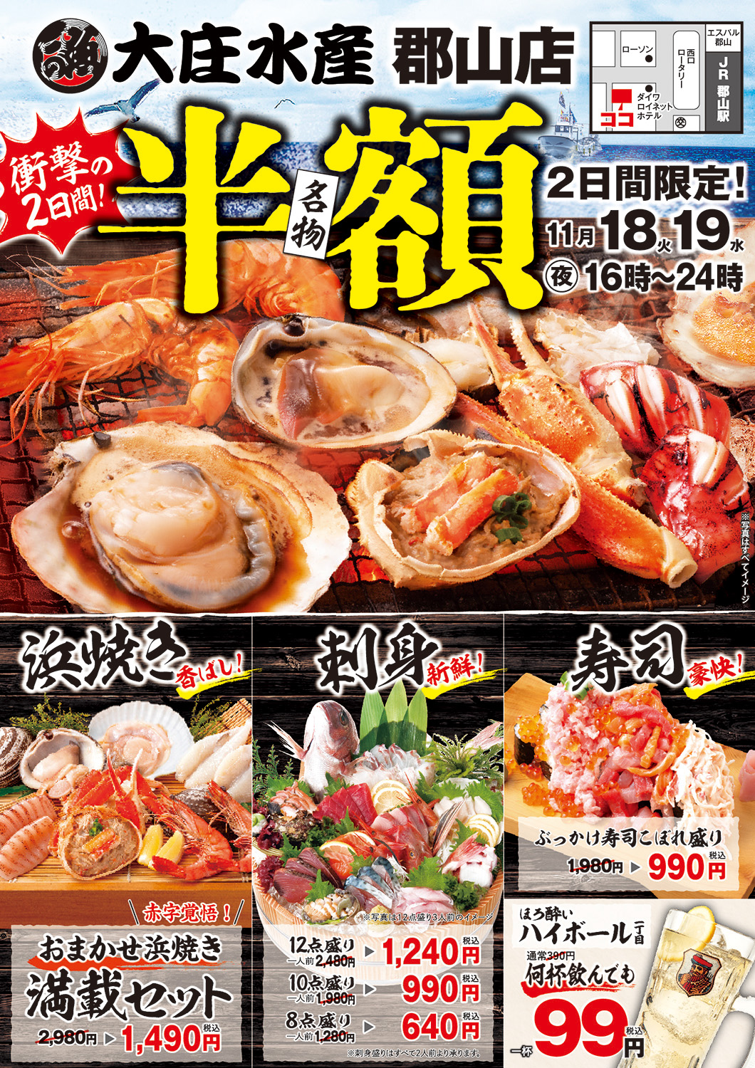 また、期間中はずっと「ほろ酔いハイボール」通常390円が何杯飲んでも1杯99円。このお得な機会に、『大庄水産』郡山店にて、豪快な海鮮料理を存分に楽しんでください。
