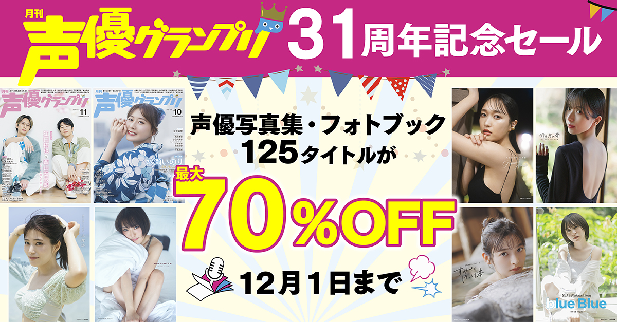 2025年11月14日(金)~ 12月1日(月)までの18日間、声グラ発の人気声優写真集や声グラバックナンバーなど全125タイトルの電子書籍が最大70%OFF(80タイトル以上が70%OFF)でゲットできる「声優グランプリ31周年記念セール」を開催!