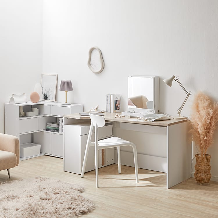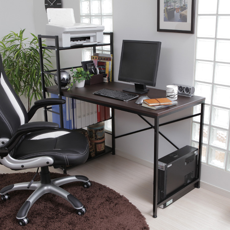 必要な物にすぐ手が届く、使い勝手の良いラック一体型デスク。限られたスペースにデスク周りのアイテムをまとめることができ、スッキリとした作業環境を叶えてくれます。