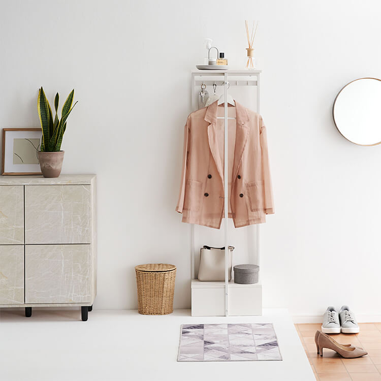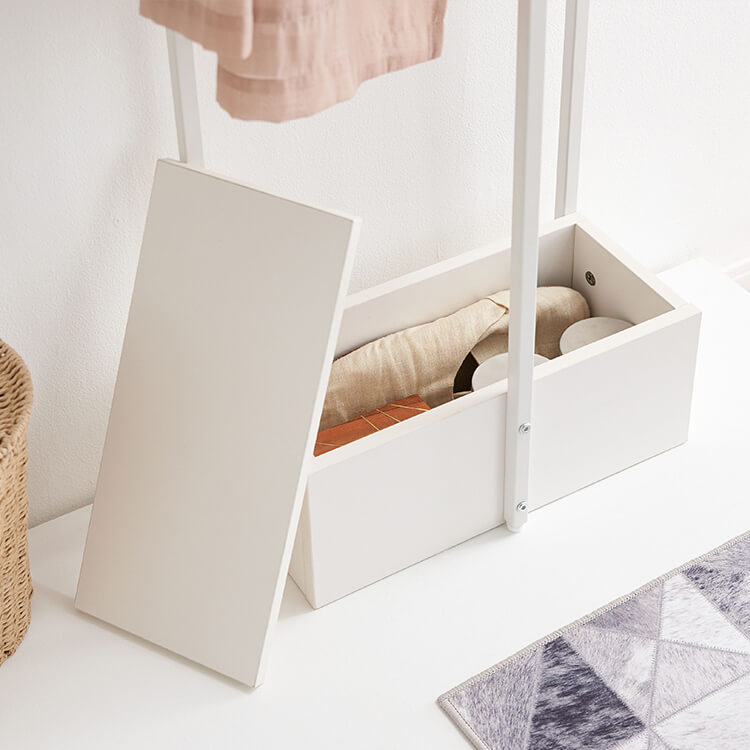 最上部のフラットな天板には、家の鍵やアクセサリーなどを置くのに便利です。下のボックスからポールまでの高さは、約114cmあるので、コートなどの丈の長いアウターもすっきり収まります。下のボックスは、来客用のスリッパなどの収納におすすめです。蓋付きなので収納した物をしっかり隠し、閉めている時は蓋の上を収納スペースとしてもご使用いただけます。