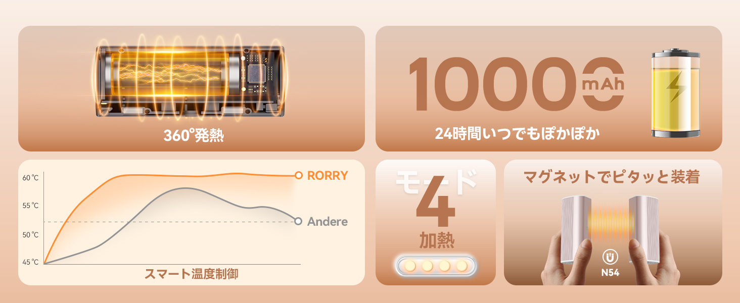 360°からじんわり広がる熱が、掌から指先までしっかり温め、外出先でも室内でも両手同時のぬくもりを体感できます。