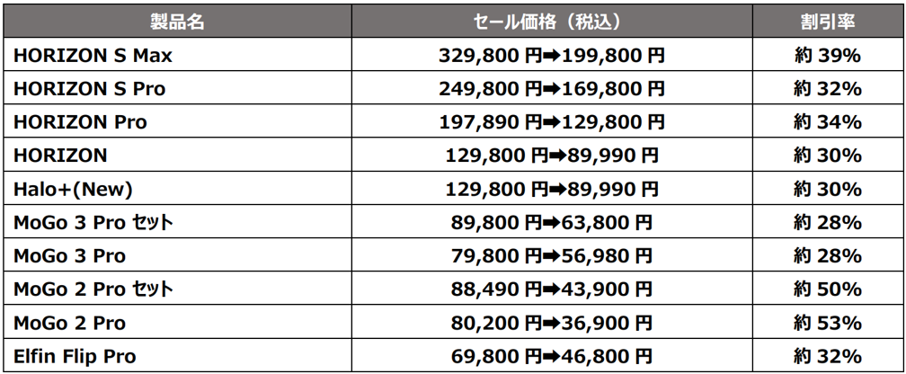 4Kホームプロジェクター「HORIZON」シリーズでは、昨年10月に発売した「HORIZON S」シリーズが最大39%OFFとお得にお求めいただけます。さらにポータブルプロジェクターの「MoGo」シリーズでは、最新モデルでスタンド一体型の「MoGo 3 Pro」が28%OFF、「Elfin」シリーズの最新モデルでバッテリー搭載かつわずか64mmのスリムボディが特徴の「Elfin Flip Pro」は32%OFFと、より手に取りやすい価格になっています。