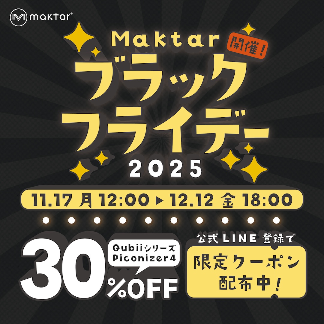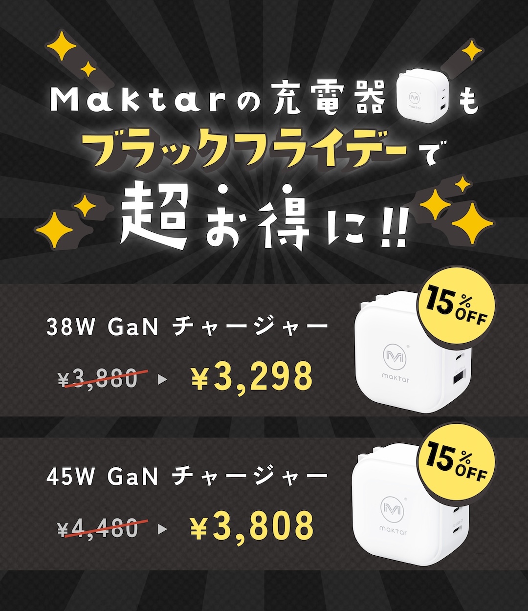 Maktar株式会社は、2025年11月17日より公式オンラインショップにて「Maktar ブラックフライデー2025」を開催しています。本フェアでは、全世界で累計販売台数100万台を突破したスマホのバックアップガジェット「Qubii」シリーズや、スマホに接続するだけで容量を拡大できる「Piconizer 4」などが最大30%OFFで登場。38Wと45Wの急速充電器もお得な価格で販売中です。