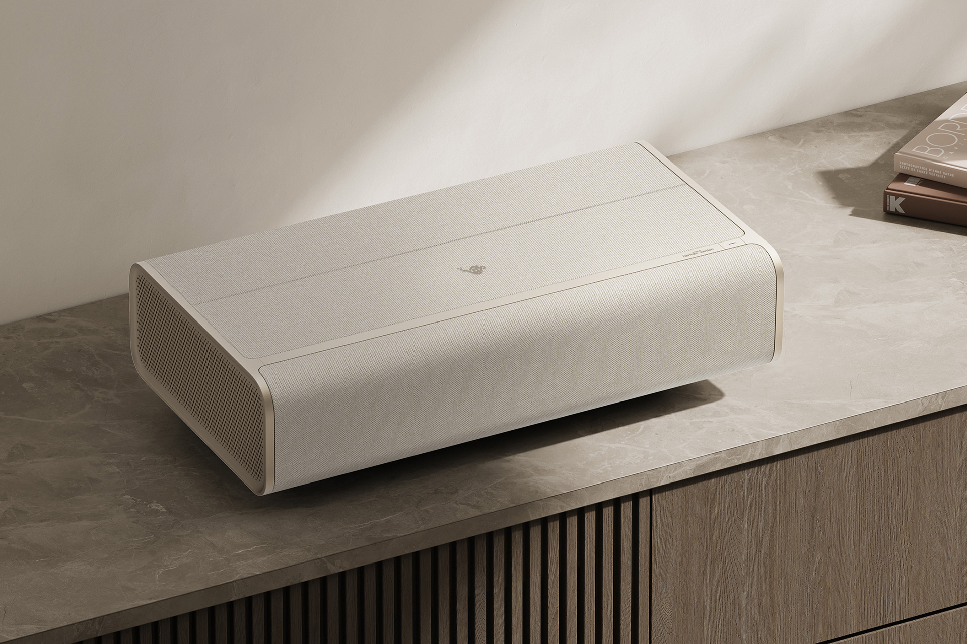 壁から24cmで100インチの大画面視聴が可能な超短焦点プロジェクター。インテリアにも溶け込むスタイリッシュなデザインでHarman Kardon製のスピーカーを搭載。投影画面のゆがみを自動的に補正する「自動台形補正機能」などの自動調整機能や最新技術デュアルライトテクノロジーの採用に加えて、Aladdin Xのオリジナルコンテンツが楽しめるAladdin OSを搭載。