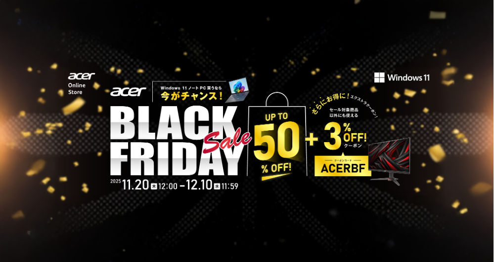 ホームキャンペーンAcer公式オンラインストア、最大50%オフの「Black Fridayセール」を12月10日まで開催