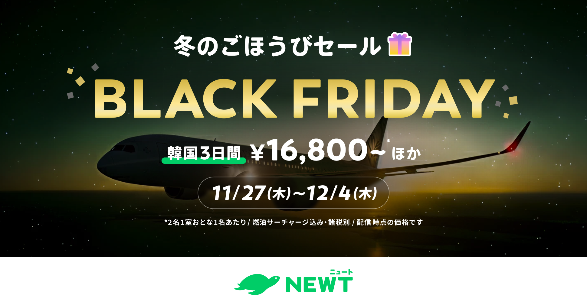 今回、旅行アプリ『NEWT(ニュート)』では、アメリカ発祥の大型セール「BLACK FRIDAY」にちなみ、さらに海外旅行をおトクにお届けできるよう「冬のごほうびセール」にあわせて「BLACK FRIDAY」を展開します。